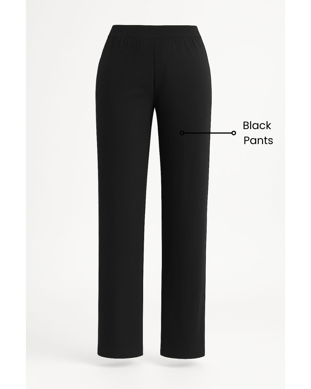 • Bottom Fabric: Black Pants – 95% Poly 5% Spandex 210 gsm