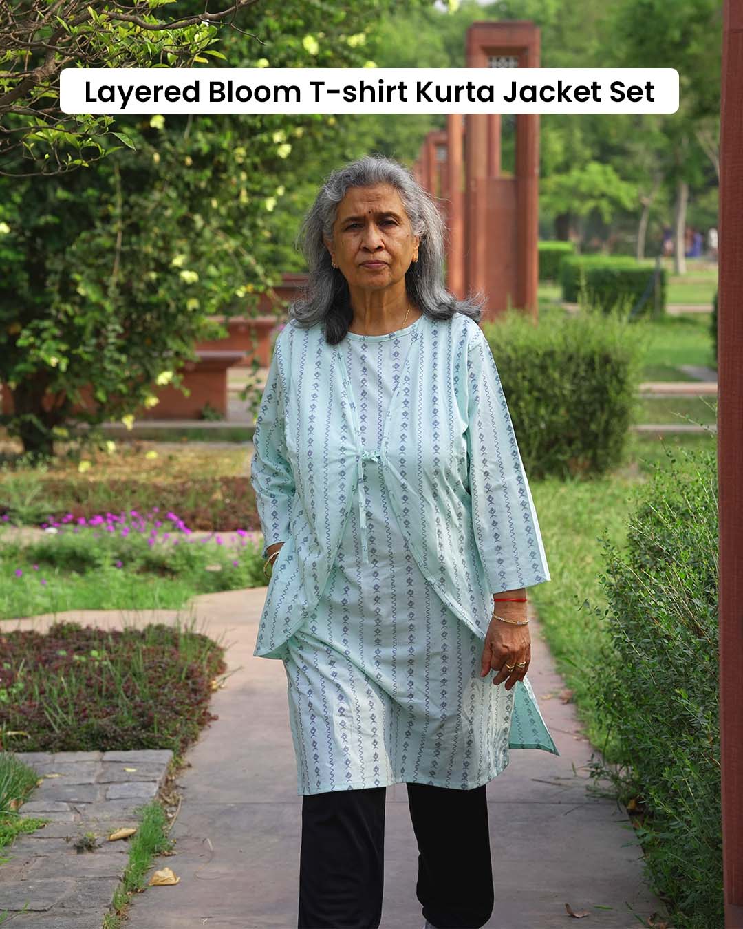 Layered Bloom T-shirt Kurta Jacket Set (T-shirt Printed Kurta with Stitched Jacket and Pant Set)