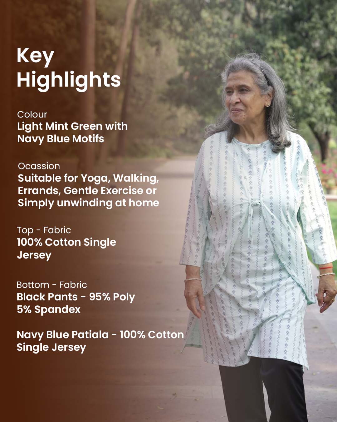 A built-in jacket adds style and light warmth to this thoughtful three-piece set. Printed kurta with a stitched-on overlay and comfy pants—perfect for travel and layering through seasons.